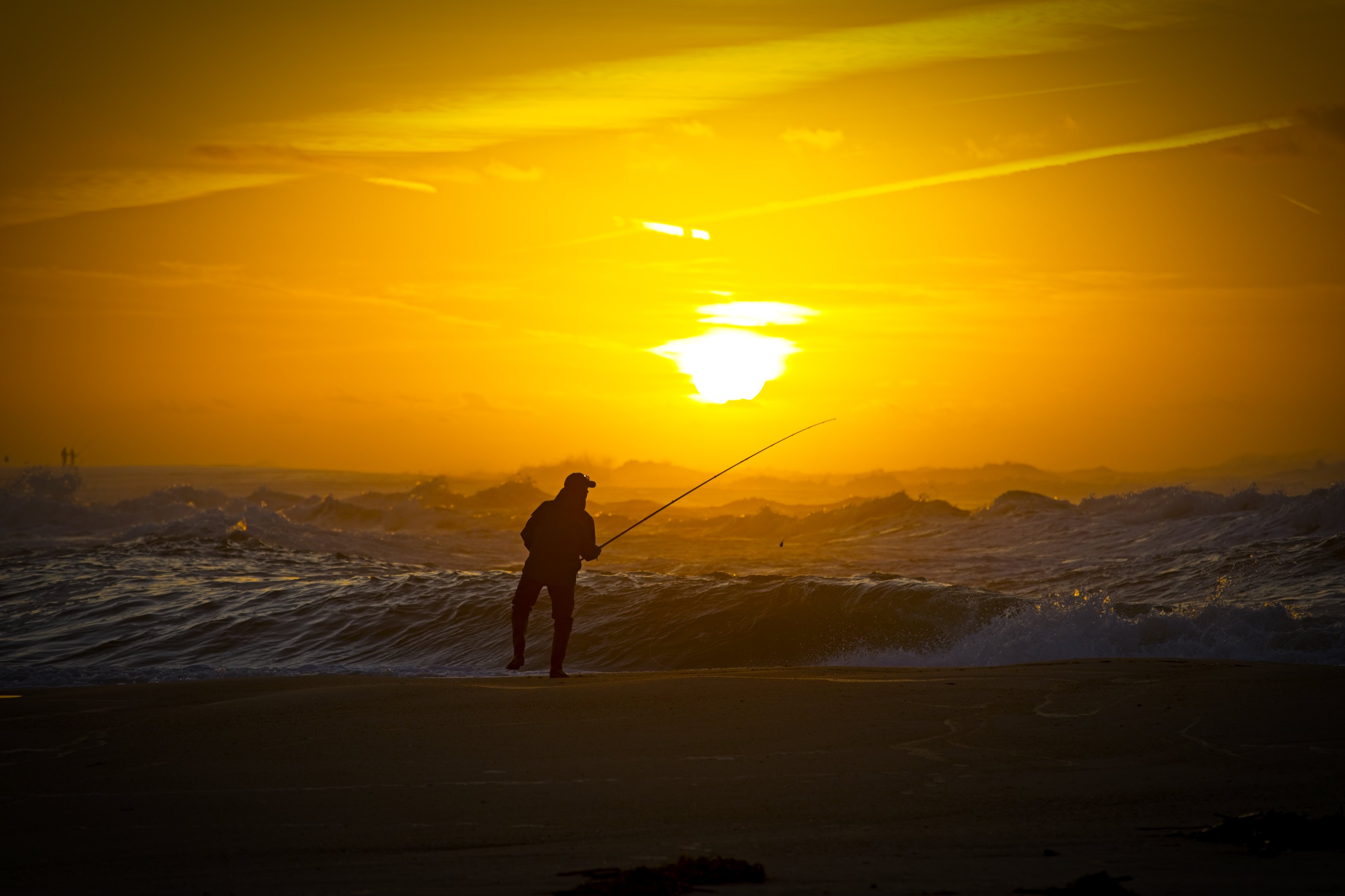 A fisherman holds his ground at the shoreline as waves break behind him, the setting sun turning the whole scene a deep burning amber.